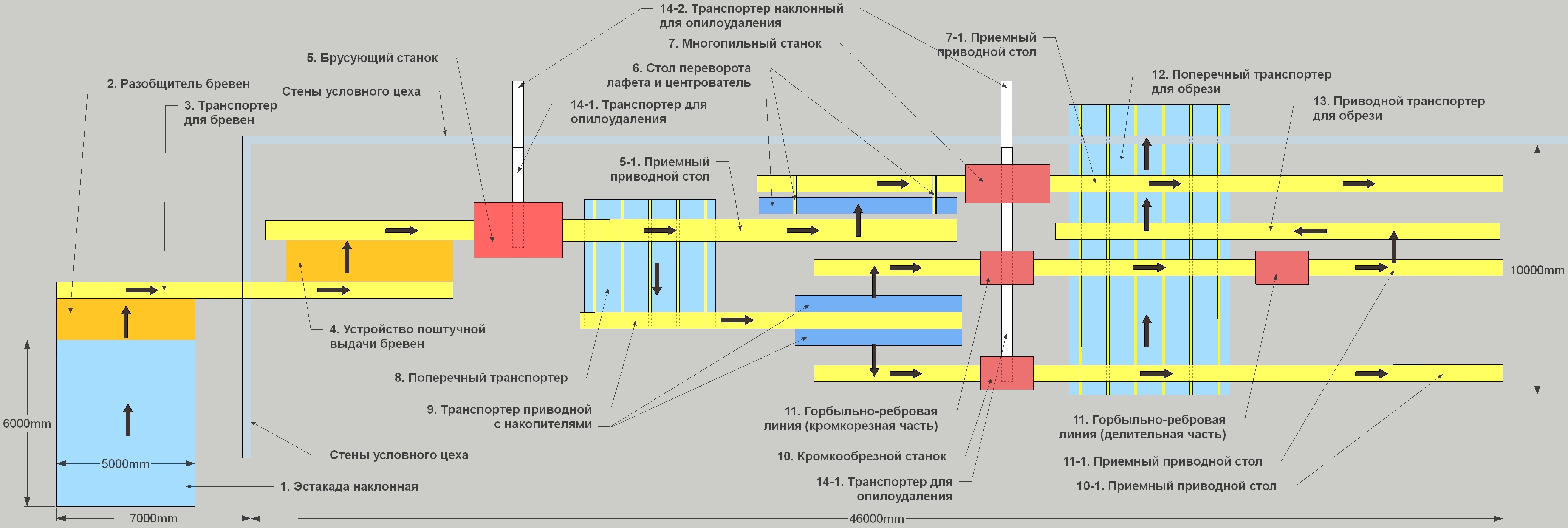 Бревна загружаются на наклонную эстакаду (1), с помощью разобщителя (2) они по одному подаются на приводной рольганг для бревен (3), затем, через устройство поштучной выдачи (4) на приемный стол брусовального станка (5). После распиловки горбыль и необрезная доска автоматически отделяются и по поперечному транспортеру (8) перемещаются на продольный транспортер (9), с которого горбыль снимается для обработки на Горбыльно-ребровой линии (11), а необрезная доска на кромкообрезном станке проходного типа (10). Полученный на брусовальном станке лафет падает на стол (6), затем перемещается и позиционируется оператором с помощью цепного центрователя для дальнейшей распиловки в многопильном станке «Вектор 2» (7). Обрезь после работы первой секции горбыльно-ребровой линии и кромкообрезного станка, а так же горбыль после многопильного станка попадают на поперечный транспортер (12) и перемещаются по нему за пределы цеха. Обрезь после второй секции горбыльно-ребровой линии подается на ленточный транспортер (13), который перемещает ее на поперечный транспортер для обрези (12). Опилки из-под станков выгребаются транспортерами (14-1), а затем удаляются из цеха по наклонным транспортерам (14-2).