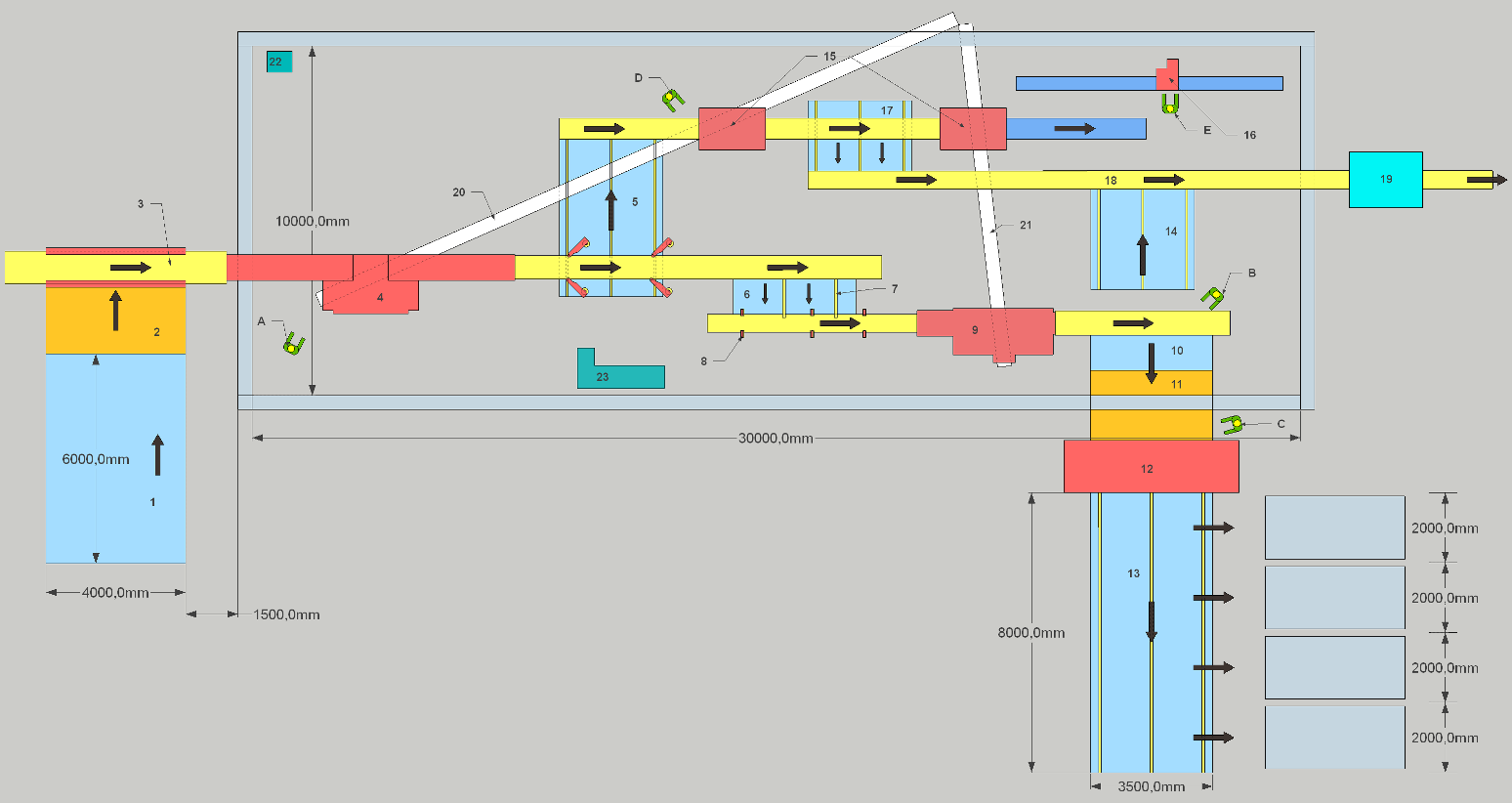 13) Сортировочный поперечный транспортер, 8м (длина досок от 1000-4000мм) |