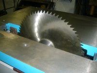 Мощный эл/двигатель 5,5 кВт расположенный внутри станины на подмоторной плите; Очень жесткий механизм подъема (с помощью которого осуществляется регулировка вылета пилы над плоскостью стола). |