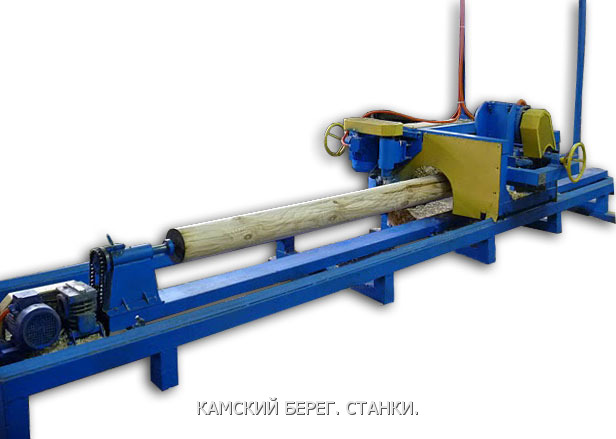 Строгание заготовки фрезой при движении обрабатывающего центра по направляющим вдоль обрабатываемой заготовки. При этом заготовка закреплена «в центрах» и может вращаться вокруг своей оси. Продольная подача тележки (при оцилиндровке и выборке продольного паза) – ручная или автоматическая (опция), подача фрезы поперек оси бревна – ручная. Частота вращения бревна – переключаемая трехскоростная.