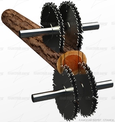 Станок "Витязь 4х630М" сделан по схеме с четырьмя валами (два верхних, два нижних), каждый пропил выполняется двумя дисковыми пилами, расположенными в одной плоскости, что позволяет получить приемлемую толщину пропила и использовать относительно недорогие и доступные стандартные пилы различных производителей диаметром 630/650 мм.