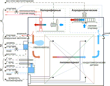 Отсюда следует, что для регулирования температуры в калориферных сушильных камерах необходимо управлять количеством теплоносителя (горячая вода) проходящего через калориферы в единицу времени. Другими словами открывать/закрывать вентиль подачи горячей воды. Для аэродинамических сушильных камер управление температурой сушильного агента осуществляется изменением производительности вентилятора (изменением сечения всасывающего воздуховода). В качестве регулирующего элемента используются жалюзи.