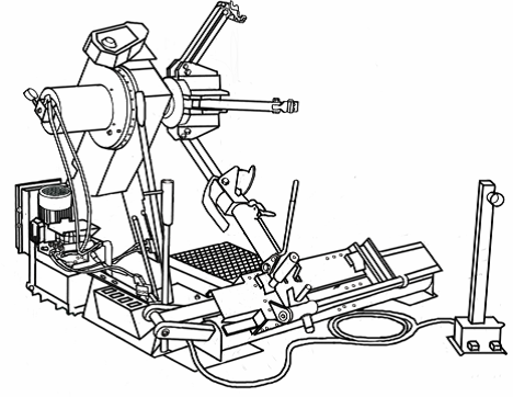 В нижней части каретки закреплен мостик, который служит для перемещения колеса с исходной позиции к лапкам механизма зажима и возврата колеса назад. Снизу у мостика имеются два опорных ролика. Поверхность пола, по которой перемещаются ролики, должна быть ровной.