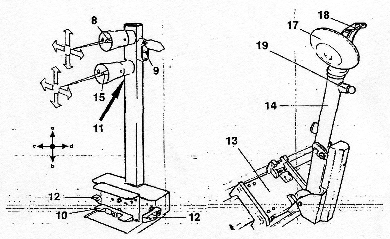 Инструмент монтажа (см. Рисунок 6) является инструментом бортирования и разбортирования колес. Он представляет собой сварную конструкцию, состоящую из несущей консоли 14 (для установки в кронштейн каретки 13), диска 17 и съемника 18. На консоли имеется рукоятка регулировки давления 19.