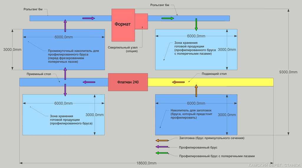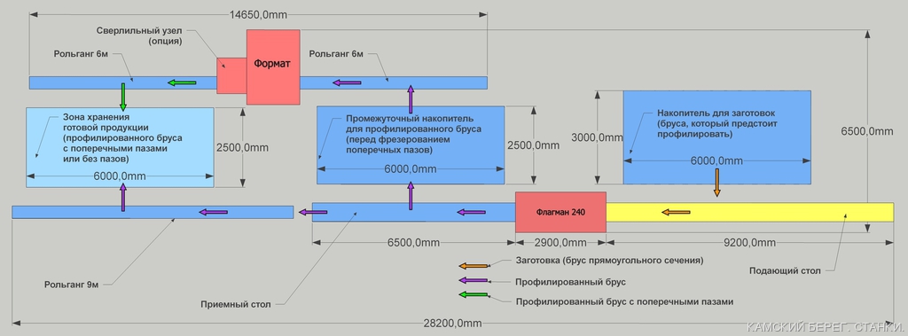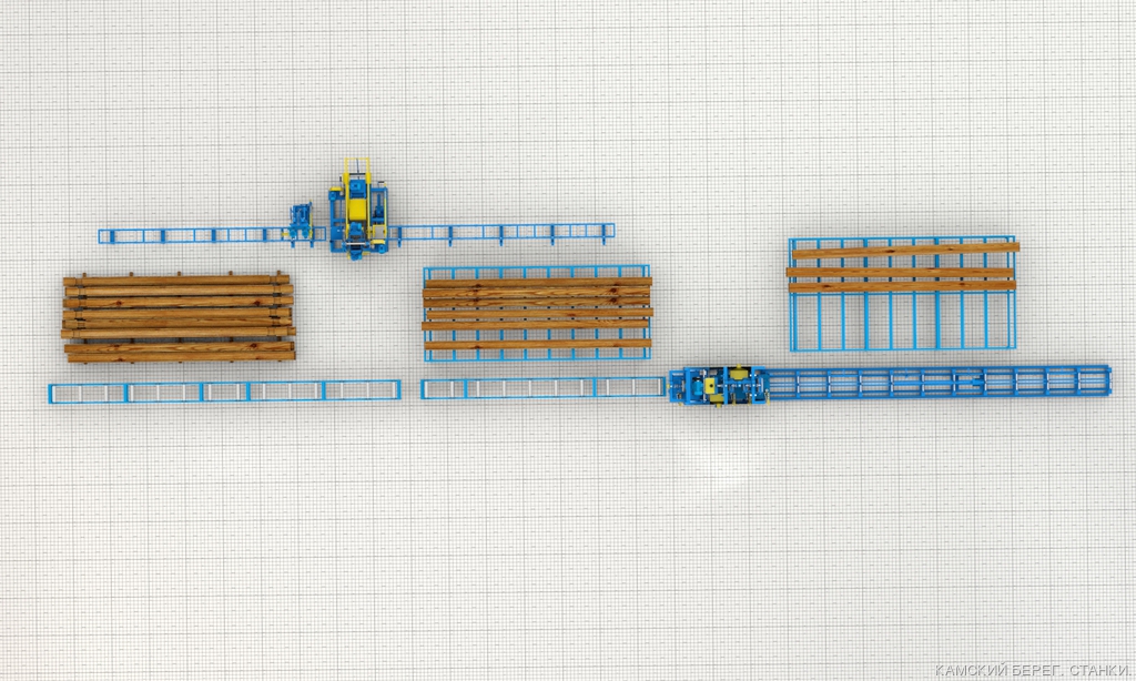 Комплекс оборудования для изготовления срубов из профилированного бруса сечением до 240х200 мм. Размещение в одну линию.