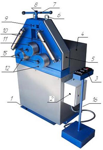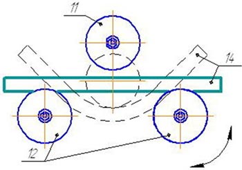 Предполагается, что заготовка будет «колебаться» в роликах, для предотвращения этого настройте направляющие валы 10 при помощи регулирующих гаек 13. Изгиб заготовки осуществляется вращением электромеханического привода (связанного с опорными роликами через шестерни), при помощи нажатия реверсивных кнопок на пульте управления 3. Смена возвратно-поступательного движения роликов осуществляется через кнопку СТОП. Для извлечения заготовки 14 возвращаем прижимной ролик 11 в верхнее положение с помощью вращения рукоятки 7, и извлекаем заготовку.