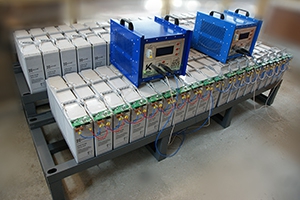 Объединив аккумуляторы расположенные на стеллаже в группы и подключив к ним зарядно-разрядное устройство можно проводить процессы их заряда или разряда не снимая с изделия.