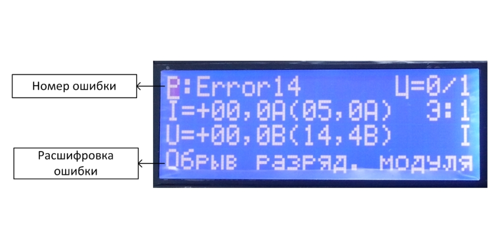 В случае аварии на индикаторе в строке №1 появится сообщение «Error» со следующим за ним номером ошибки, при этом в строке №4 будет расшифровка данной ошибки, что облегчает диагностику неисправности (Рисунок 3).