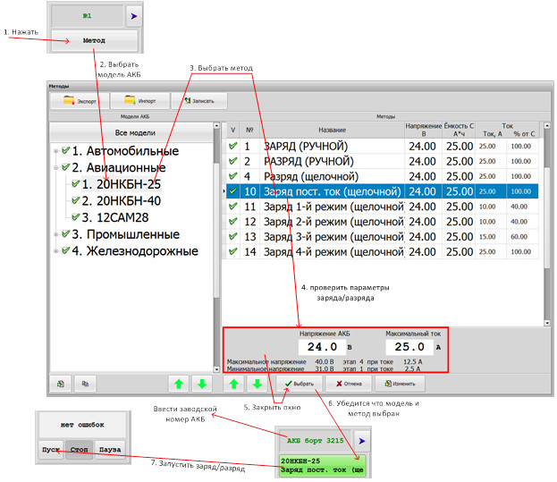 Использование ControlEnergy 2 делает заряд аккумулятора максимально простым. В базе программы содержатся десятки распространенных аккумуляторов, позволяющих устройству заряжать АКБ полностью в автоматическом режиме, а запуск на заряд не требует специальных знаний об устройстве аккумулятора. Поэтому с данной задачей может справиться даже человек, не имеющий специальной подготовки. Запуск заряда показан на рисунке: