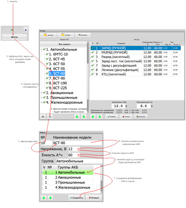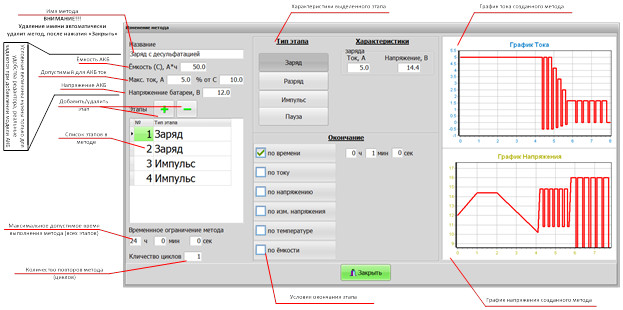 Если Вы профессионально занимаетесь обслуживанием и ремонтом АКБ, то ControlEnergy 2 позволяет самостоятельно создавать уникальные алгоритмы заряда, редактировать существующие и добавлять новые уникальные типы аккумуляторов. Редактор методов заряда: