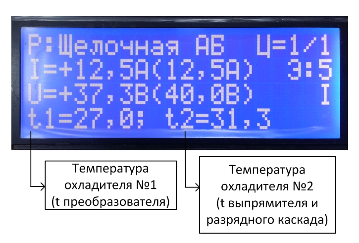 В процессе работы нажатием кнопки «Параметр» можно переключать отображаемые параметры: отображать время и ёмкость или отображать температуру ЗРУ (Рисунок 2).
